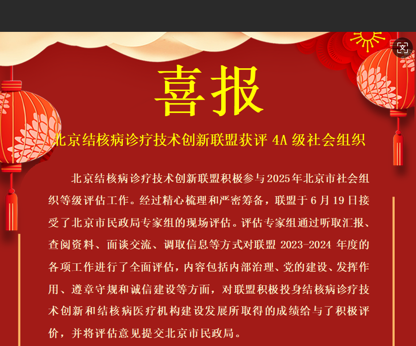 喜报!北京结核病诊疗技术创新联盟获评4A级社会组织