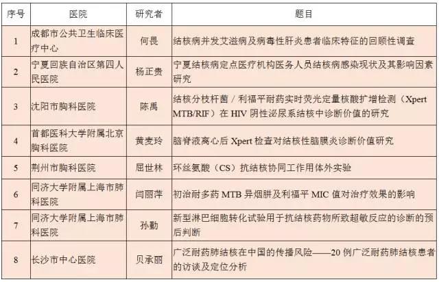 截止 4 月 1 日申报结束,CTCTC 办公室共计收到项目申请意向书 52 份,通过形式审查及两轮专家评审,优选出8项科研课题予以资助,申请者及其申报课题名 单见下表。八位申请者已于5月26日中华医学会结核病学分会 2017 年学术大会 CTCTC 专场获颁资助证书。CTCTC 首次开展原创临床研究的基金项目正式拉开了帷幕,期待为期一年的 8 个科研目均能获得预期产出,CTCTC办公室将密切跟进这些科研课题的进展和科研经费的使用。
