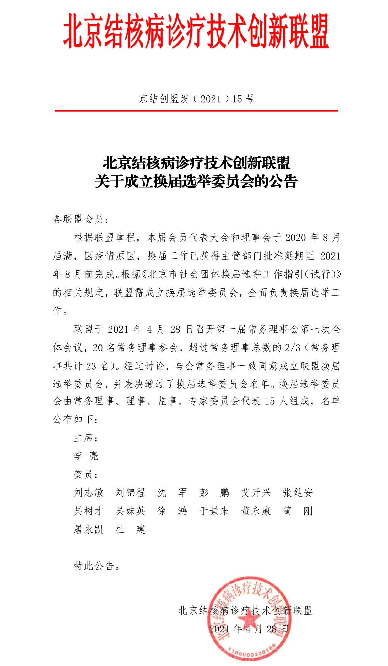 关于成立北京结核病诊疗技术创新联盟换届选举委员会的公告